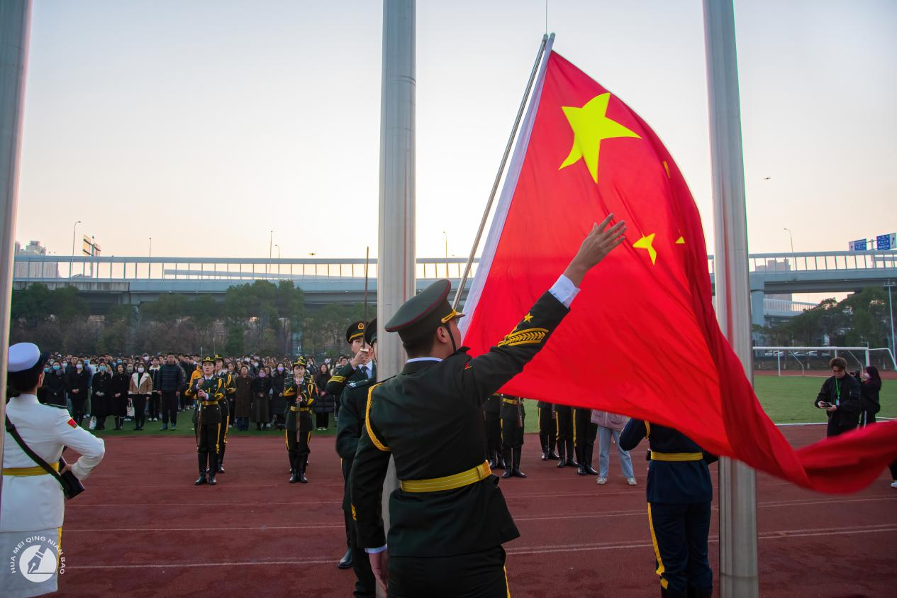 国旗护卫队踏着矫健的步伐,以饱满的热情护卫五星红旗进场。随着《义勇军进行曲》响彻整个校园,鲜艳的五星红旗在全体师生的注目中冉冉升起。全体师生庄严肃立,传递着对祖国的热爱和崇敬。