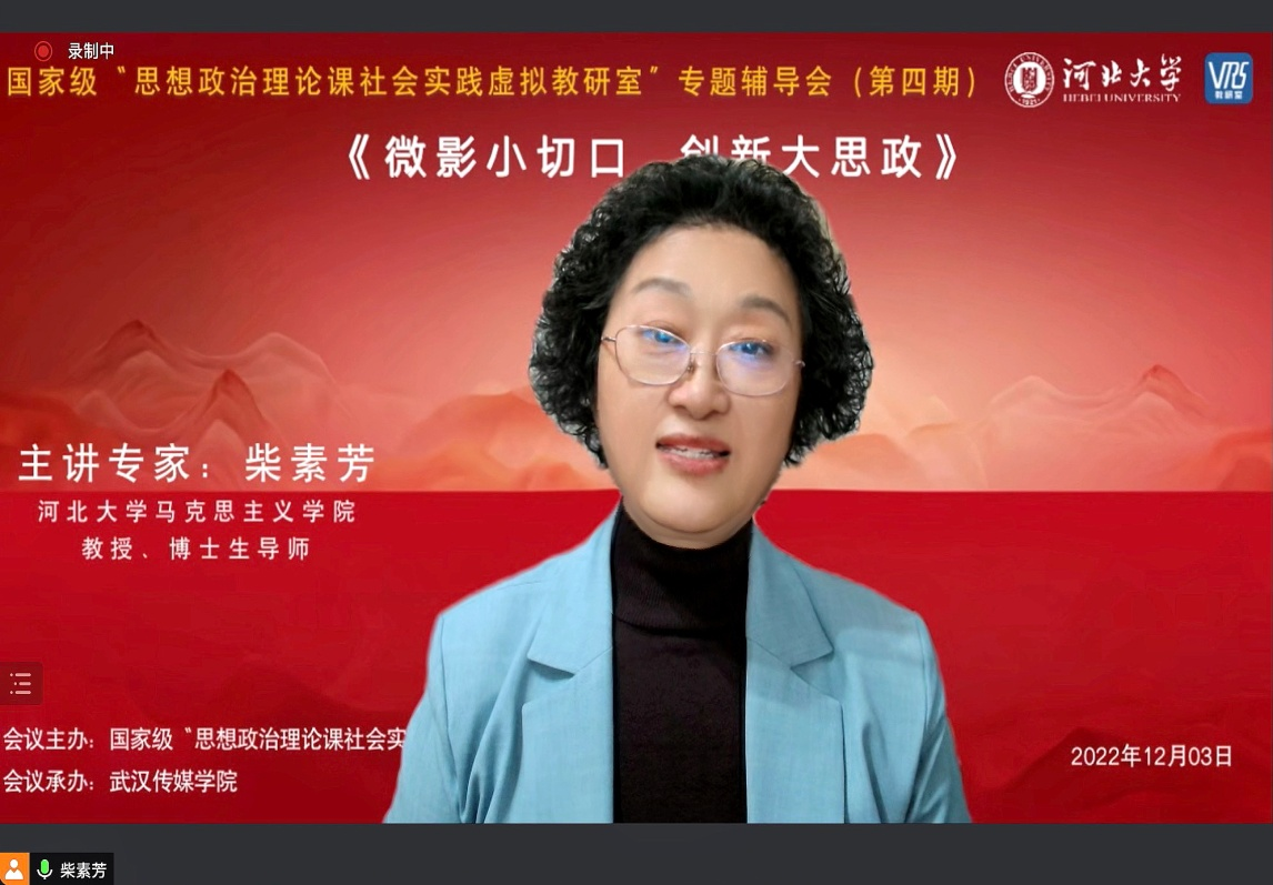 为主动适应信息化时代青年学生的多样化需求,赋予我校思政课高质量发展新动能,构建好“大思政”格局,12月3日上午,我校马克思主义学院承办了国家级“思想政治理论课社会实践虚拟教研室”第四期专题辅导会,会议在教育部虚拟教研室客户端(B版)举行。主讲专家为国家级一流本科课程《思想政治理论课社会实践》负责人、国家级虚拟教研室《思想政治理论课社会实践虚拟教研室》负责人、教育部首批“全国高校思政课教师年度影响力人物”、全国高校思政课名师工作室负责人柴素芳教授,报告题目为《微影小切口 创新大思政》。我校全体思政课教师参加会议,会议由罗晶晶老师主持。