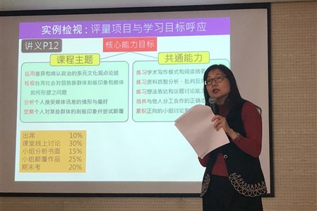 培训第一天“成果导向课程设计的理念与实务”工作坊,李纹霞博士重点阐述了OBE模式课程的执行原则,强调要从认知、技能、情谊三种纬度建构学生的核心能力目标,并以自己成功实施成果导向教育的“多元文化与媒体再现”课程为例,介绍了如何以学生为中心来设计可评量可考察的课程目标,以及达成目标的教学活动和引导学生成功学习的有效评量方式的设计。第二天“课程评量检视与标量指标设计”工作坊,李纹霞、李承恩老师,以我校教学大纲为典型实例,带领参训教师练习了Rubric评量指标的运用和设计。整个培训过程,两位老师综合运用了案例教学、分组讨论、体验分享、参与互动的方式,让参训学员在学中练、练中学,更深入地理解OBE模式课程学生核心能力的指标设计原则及方法。