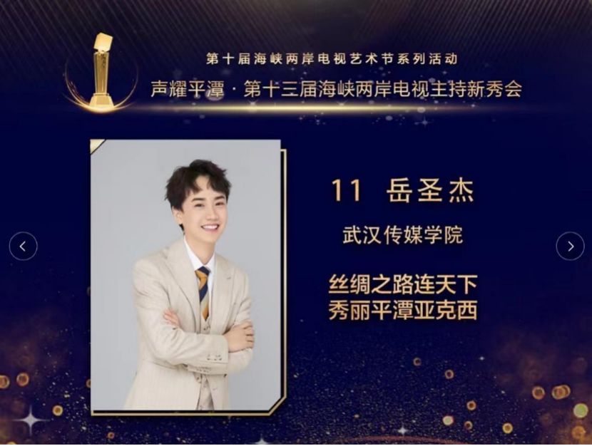 从校园选拔赛的金奖到《时代新声》的再次登台,再到“声耀平潭”第十三届海峡两岸电视主持新秀会,岳圣杰一路可谓是“过五关斩六将”。