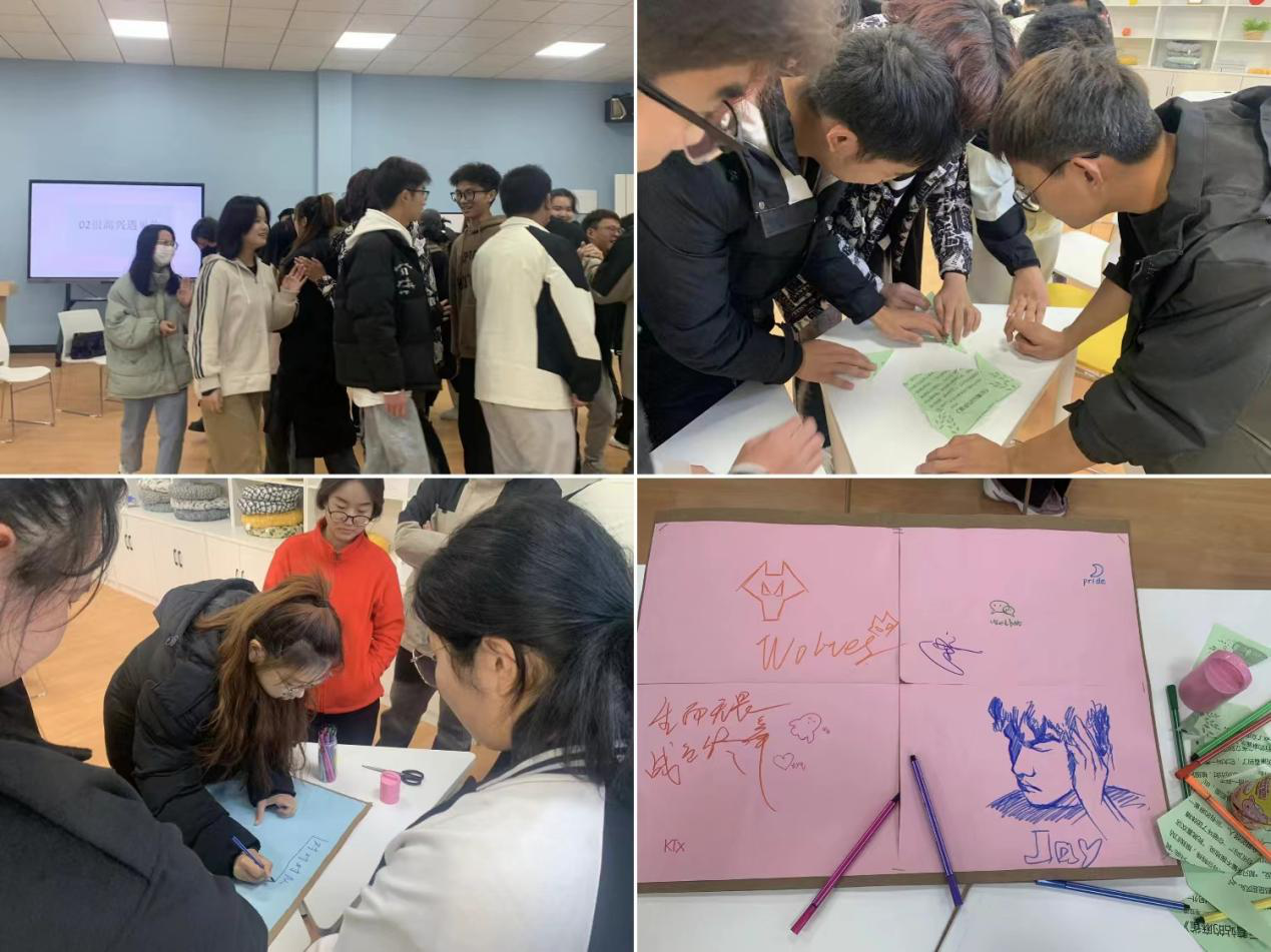 活动开始,董维老师用“大风吹与小风吹”和“很高兴遇见你”两个暖身游戏破冰,活动现场气氛活跃了起来,并介绍了什么是团体心理辅导及其重要意义。紧接着,大家通过寻找“失落的秘籍”的游戏来分队,即每位同学手中都有一张秘籍碎片,能拼成一张完整秘籍的同学即为一个队伍。两支队伍结合队员的想法和创意,相互合作,完成取队名、形成团队契约和创作团队形象的任务,然后轮流上台展示。团队成员在创作中加强了人际沟通,并展现出集体智慧,促进了团体的形成与紧密连接。