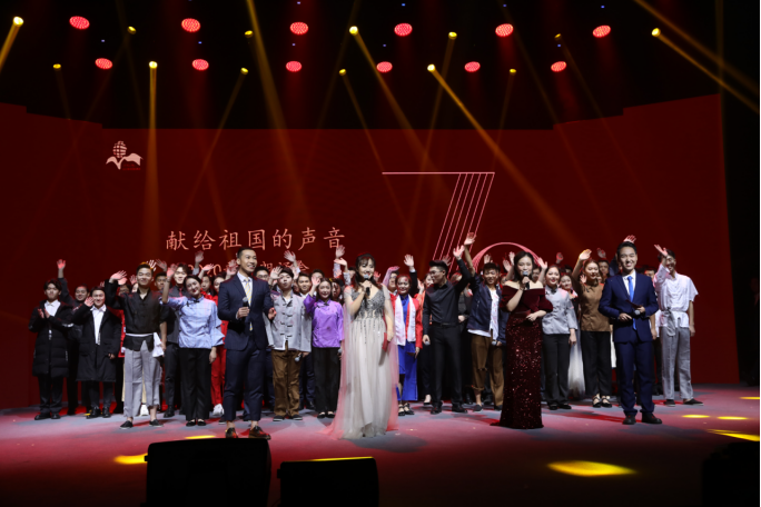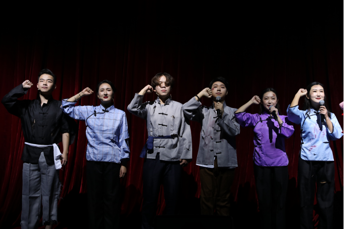 新中国已走过70年的光辉历程,正因为有着祖国亿万同胞的共同奋斗,才谱写了一幕幕可歌可泣的诗篇。下午场朗诵会由武汉传媒学院播音主持艺术学院学生拉开序幕。朗诵者以诗献礼,声抒长情。当灯光亮起,学生们穿着整齐的白衬衫,呈“M”形状错落有致地站在灯光闪耀的舞台上,个个精神抖擞、气宇轩昂。随后,一位身着红色大褂,颇有“巾帼不让须眉”气势的女生击起了鼓,气势磅礴的阵阵鼓声与朗诵者们铿锵有力的“有朋自远方来,不亦乐乎?”的朗诵将此节目推向高潮,赢得热烈的掌声。
