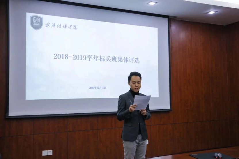 武传新闻网讯 (记者 叶信乐 见习记者 樊明硕 林安琪 图/摄影 武汉传媒学生会)12月10日下午18:00,武汉传媒学院2018—2019学年优秀班集体、标兵班级体评选活动在行政楼206举行。此次评选通过公开演讲的形式,组织各班优秀学生代表依次上台演讲。评选活动邀请了学生工作处副处长余恺老师、学生工作处翟宗巍老师及各院团委书记等七位老师作为大会评委。
