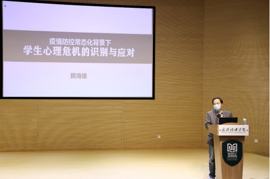 为切实加强我校疫情防控常态化背景下学生心理健康教育工作,进一步增强我校学生工作队伍的心理危机处理能力,2022年4月14日下午,武汉传媒学院心理中心邀请武汉大学赖海雄教授在圆形报告厅开展了“疫情防控常态化背景下学生心理危机的识别与应对”专题讲座。学工处副处长余恺、各学院党总支部书记、副书记、全体辅导员、保卫处和后勤处相关人员、心理中心教师聆听了此次讲座,讲座由心理中心主任李霞老师主持。