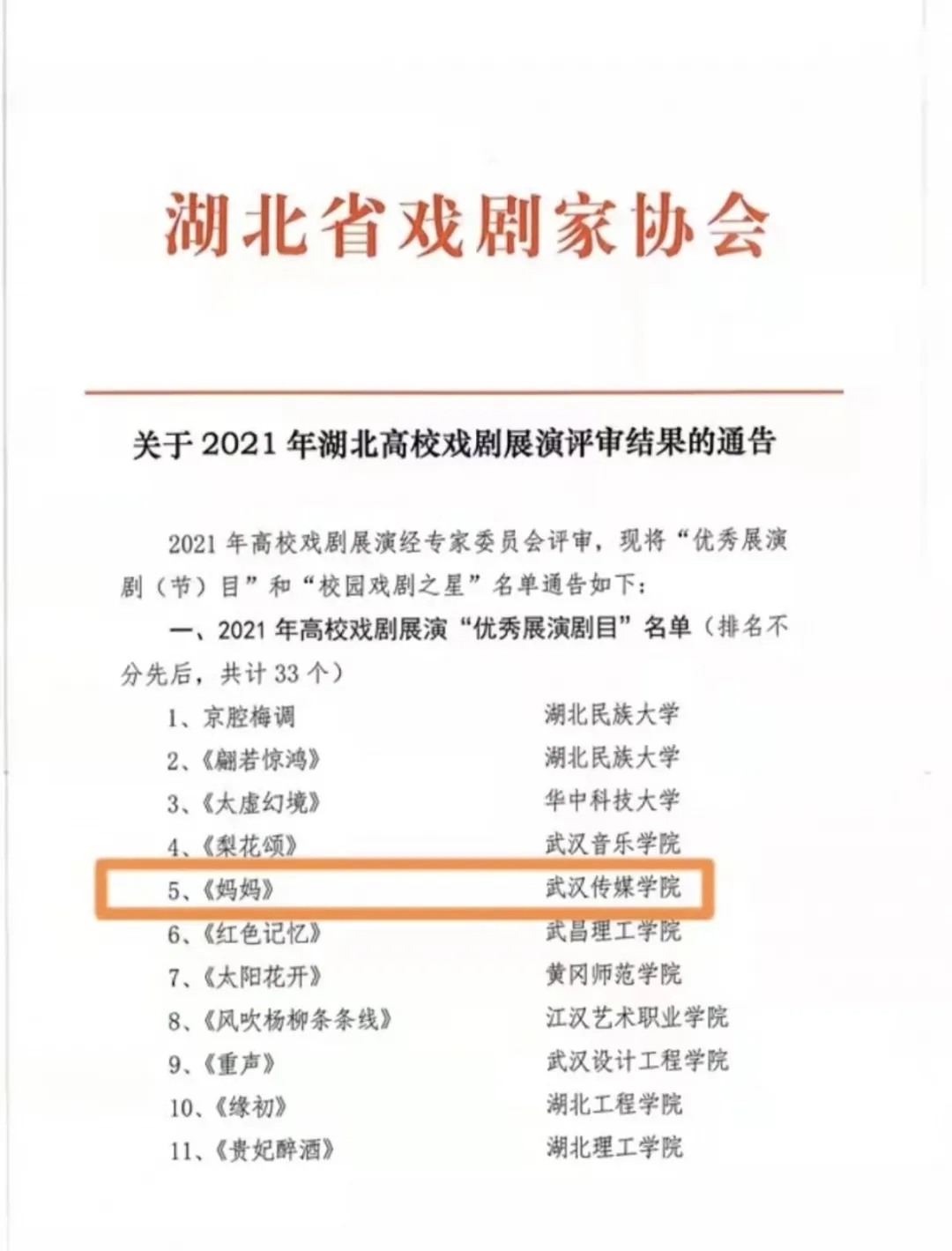 12月08日,2021年湖北省高校戏剧展演评审结果正式公布,由我校选送人文与艺术学院“18级音乐学”师生自主原创的原本性音乐戏剧《妈妈》,荣获“优秀展演剧目”奖。这是我校连续三年在湖北高校戏剧展演活动中获得殊荣。