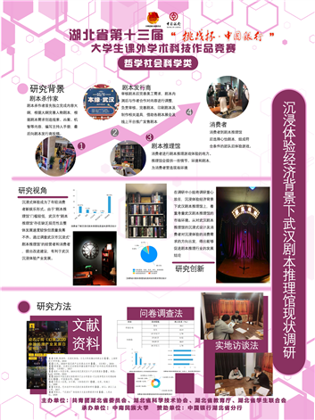 自2017年以来,沉浸式体验成为了当今年轻消费者的新娱乐模式,行业经济种类主要有密室、鬼屋、推理馆、展览四大类,其中推理馆相较于其他类别具有新颖、大众、门槛较低的优势。武汉市“剧本推理馆”整体发展速度较快,但由于“剧本推理馆”门槛较低,存在着缺乏规范性、质量良莠不齐的问题。鉴于业内对“剧本推理馆”相关的调研分析较少,来自我校文化管理学院文管B1801班的蔡静、栾瑾、彭冰、许可、李宗哲、邹敖翔、冯文岩同学组成团队,从物质与精神两方面出发,将重心放在“剧本推理馆”产业之下的沉浸式体验上,开展了对于武汉市“剧本杀推理馆”的经营者与消费者的调查,挖掘出“剧本推理馆”中各方面存在的问题,并提出改进建议,加速武汉市沉浸式“剧本推理馆”进一步发展。
