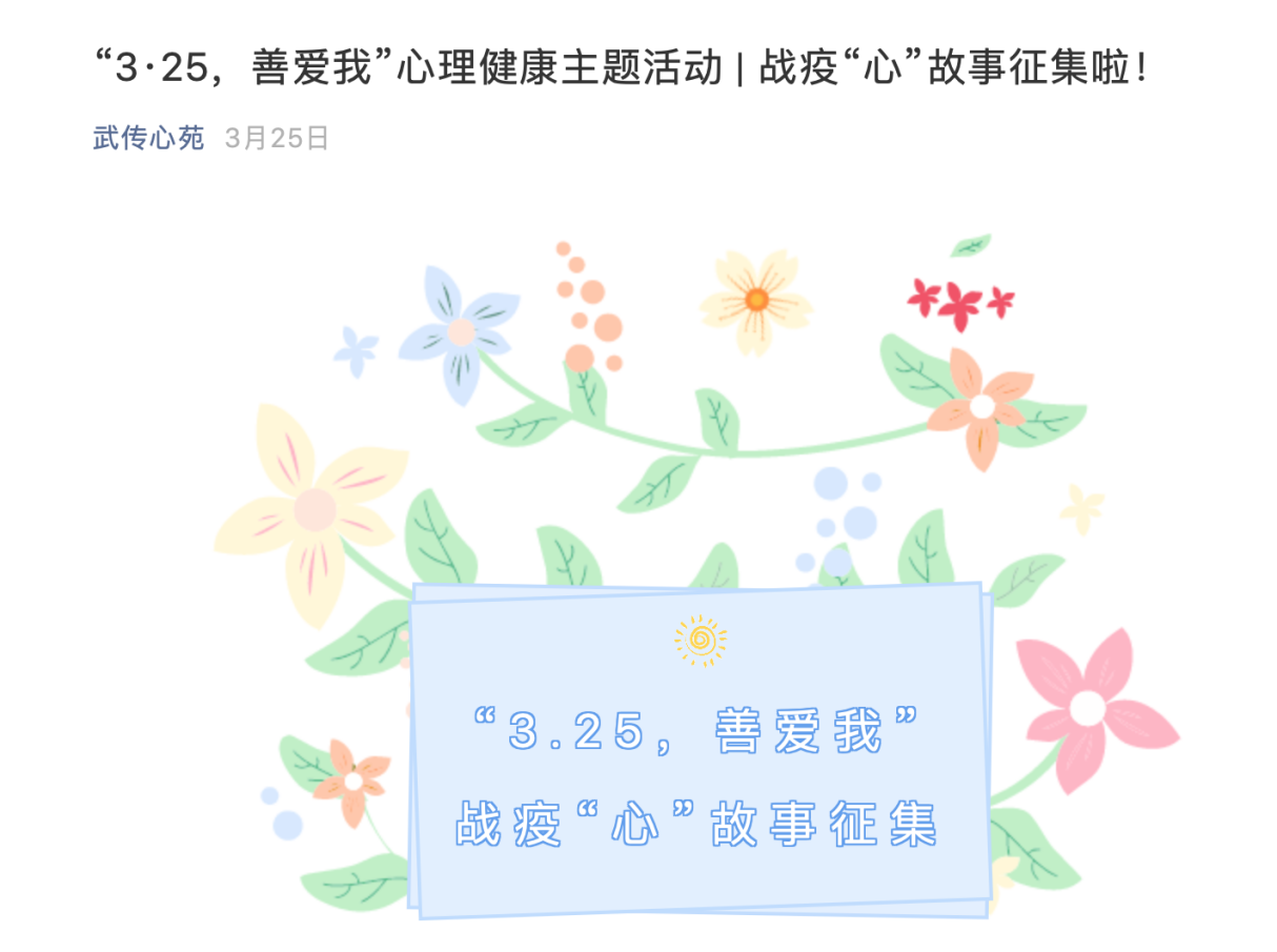 2020年3月25日-4月15日,武汉传媒学院大学生心理健康教育中心开展“3·25,善爱我”心理健康主题活动——战疫“心”故事征集。本次活动旨在倡导大学生善待自我,关爱自我,怀着一份温暖,包容欣赏和接纳自己,传播抗疫期间的心理正能量。