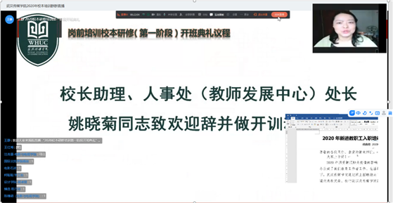 在开班典礼上,校长助理、人事处(教师发展中心)处长姚晓菊同志代表校党委、校行政领导班子致欢迎辞并做开训动员讲话。她对新进教职工加盟我校表示热烈欢迎,感谢大家在今年这个特殊的时期选择武汉传媒学院作为自己职业生涯的起点和平台,并对新教职工提出了四点希望和要求。一是要充分理解高校教师职业的深刻内涵,担当起教书育人的崇高使命,“做学生锤炼品格的引路人,做学生学习知识的引路人,做学生创新思维的引路人,做学生奉献祖国的引路人”。二是要真心热爱高等教育事业和教师职业,不要仅仅满足于做一份工作,而要将其作为体现人生价值的舞台,辛勤耕耘,体会“教学相长,教书育人”的快乐,收获“桃李满天下”的幸福。三是要充分认识到岗前培训的重要性和必要性。强调本次培训是学校精心设计的特色校本课程体系,分线上和线下两个阶段共计12天69学时,内容包含职业认知、校情校史、制度流程、师德师风、心理素养、教学规范、教育技术、教学设计、教学评价、课程思政等十大专题,能较好地在理念、思路、方法、实践上给予新教职工全方位地引导和指导。希望大家珍惜学习机会,全身心地投入,做到人在心在,养成终身学习的好习惯。四是要坚定信念,做好自己的职业发展规划,迅速实现角色转变,从低起点做起,开好头,起好步。最后特别强调大家要严格遵守培训纪律和疫情防控管理规定,保障身体健康,圆满完成培训任务。