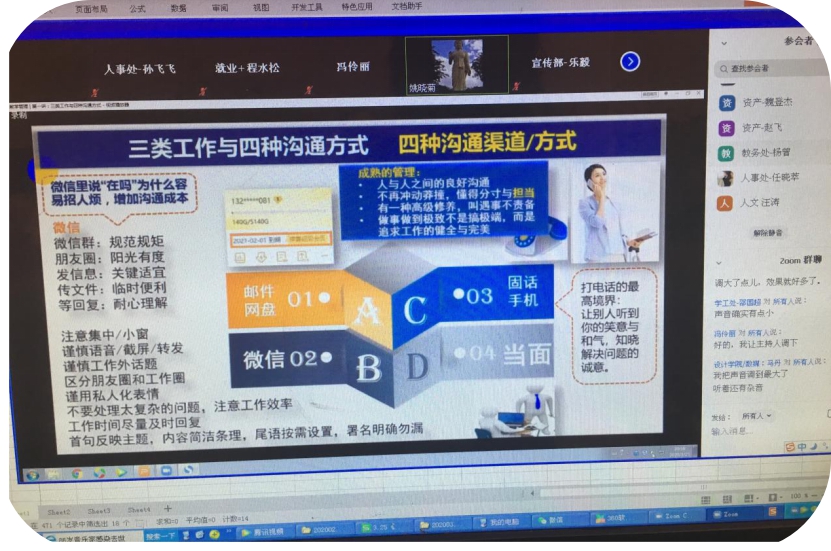 武传新闻网讯(文/记者 冯伶俐)3月25日晚,我校教师发展中心组织我校教学和行政管理干部在网上参加了《“三类工作”与“四类沟通方法”》公益直播培训,拉开了我校教学管理干部系列培训的序幕。本次培训由天津外国语大学国际商学院院长郭建校教授主讲。学校各学院党总支书记、教学副院长、教研室主任、教秘、行秘和全体行政职能部门副科级以上干部及教学管理相关人员100余人参加了本次培训。培训会议由学校校长助理、人事处(教师发展中心)姚晓菊主持。