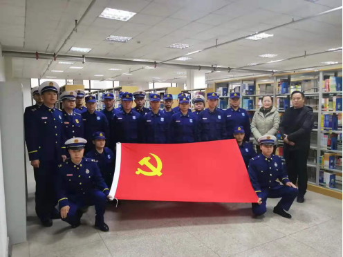 2019年11月28日下午,武汉市东湖高新区消防救援大队在我校图书馆开展党员主题教育交流学习。校保卫处和图书馆负责人进行了热的接待,并在图书馆三楼共同学习交流通红色书籍。大队党员代表认真学习并做好相关笔记,交流结束后大家共同合影留念。