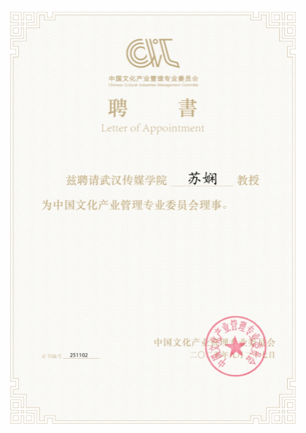 (通讯员 武思雨)近日,中国文化产业管理专业委员会2025年会长与常务理事会议审议结果正式公布,武汉传媒学院文化管理学院苏娴教授、蒋冬青教授凭借多年学术沉淀与行业实践积累,成功当选该委员会理事。