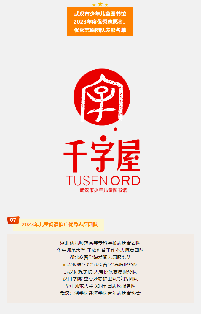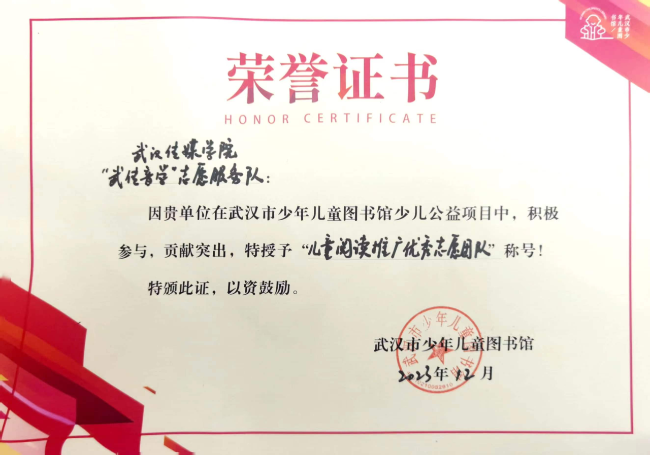 2023年12月17日上午,“亲子共读·陪伴是最美童年”活动年度展示暨武汉市少年儿童图书馆志愿者颁奖典礼活动在中南剧院举行,武汉传媒学院人文与艺术学院音乐学专业“武传音学”志愿服务队受邀参加,并喜获“2023年儿童阅读推广优秀志愿团队”称号。