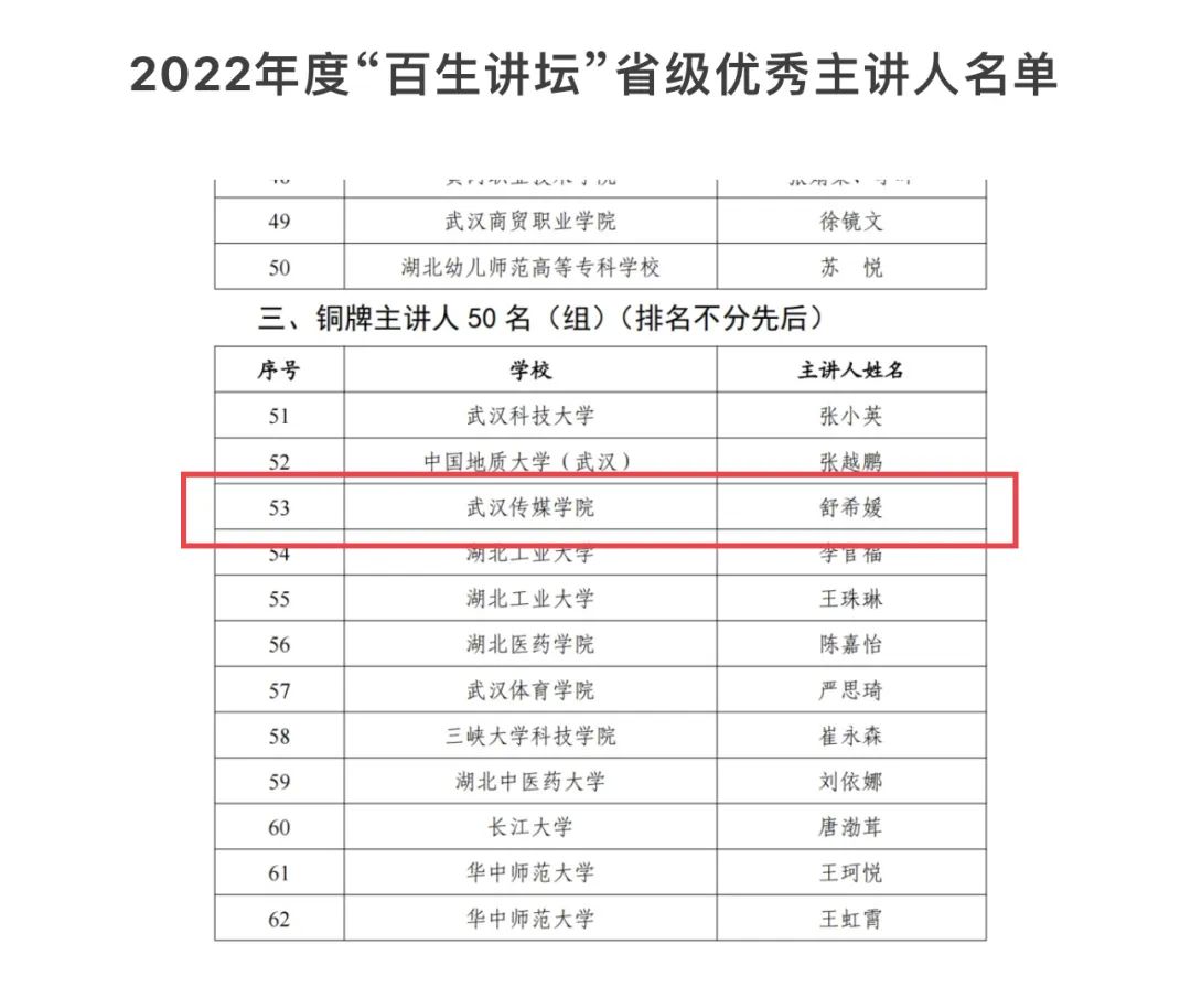 武汉传媒学院播音主持艺术学院播音主持艺术专业B2102班团支书舒希媛同学在“百生讲坛”活动中获得了省级优秀生讲人,这是我院同学在演讲技巧、思考深度和表达能力等方面的全面提升的体现,也是对优秀学生的充分肯定和鼓励。