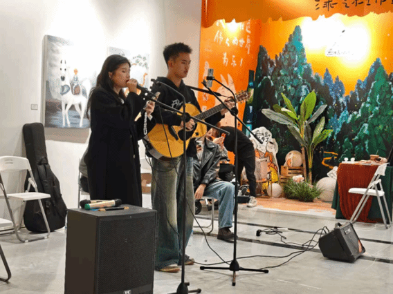 其中,两支文创方向团队负责艺术家招募、展位设计、文创产品开发,以及六个生活美学品牌的招商运营:“不解释队” 联合驼鹿、表面大人、作作样纸、阿奇霉素与肾上腺素等创作者,呈现绘画、IP 设计、手作产品等多元文创内容;“今日不刷手机” 团队携手子梧 Ziwu 陶瓷工作室与 LeRoieste 勿忘我,围绕陶艺与自然美学打造 “物的温度,光的记忆” 主题展区。另一支演艺方向的 “喵哉喵哉毕设团队”,则联合柒弦吉他社策划执行四场校园吉他演出,并统筹专业演出团队全程参与,以音乐串联艺术氛围,展现出从内容策划到现场落地的完整执行能力。