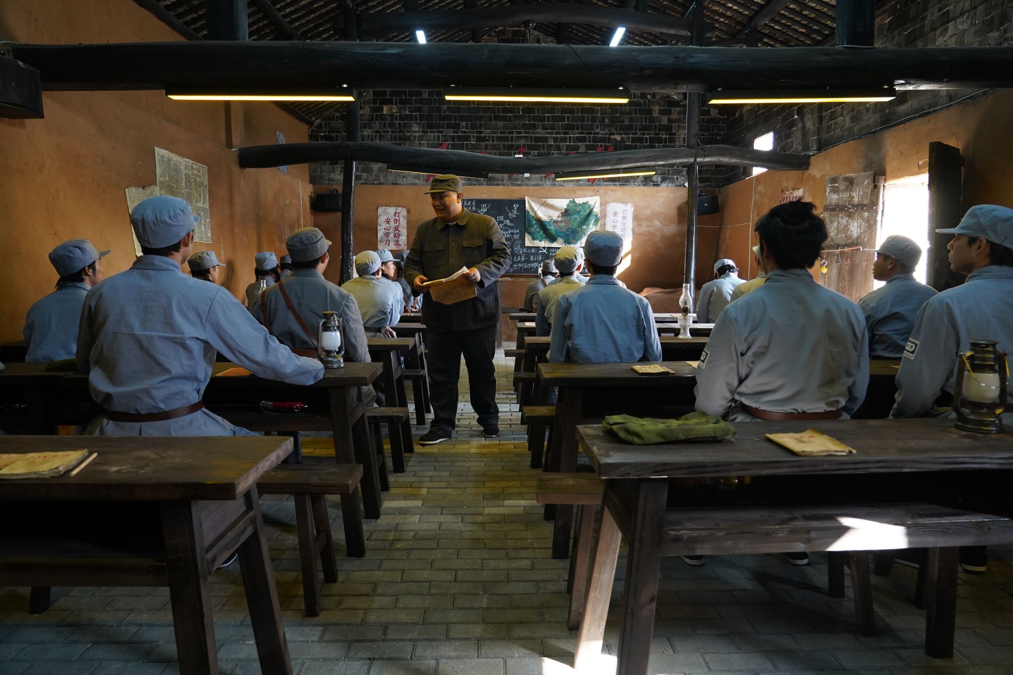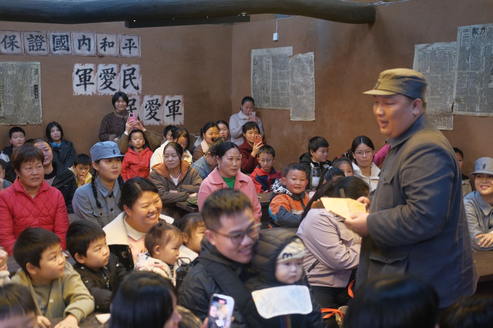 《1946・中原突围》以真实历史为蓝本,通过沉浸式实景呈现,生动还原 1946 年中原突围的峥嵘岁月。演出中,“新四军”战士扮演者身着具有历史质感的蓝色军装,眼神坚毅,与“民众”角色并肩而立,以嘹亮声线齐诵和平诗篇,瞬间将观众带入热血坚守的革命年代。 为增强观众参与感,演出设计多环节沉浸式互动:模拟课堂场景中,演员以随堂提问形式引导观众讨论“突围战略”,现场氛围迅速升温;少年演员化身“课堂学生”,通过生活化的互动表演与精湛拳脚展示,既展现革命年代青少年的鲜活形象,又以轻松幽默的表达赢得观众阵阵掌声,不少观众现场高呼“看不够”。演出期间,部分观众踮脚驻足欣赏,更有观众主动与演员合影留念,充分体现出演出的吸引力与感染力。