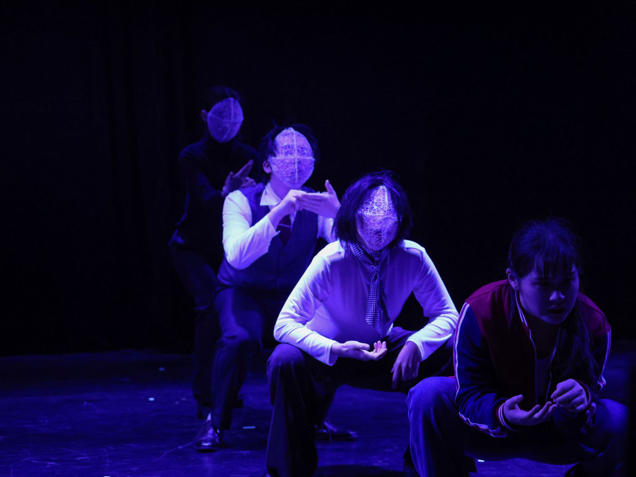 针对舞台道具“面罩”的象征意义,周洲老师表示:“使用面罩的初衷,是将剧中主要角色与其他角色区分开来。用钢丝搭建面罩骨架,除了能让道具更稳固外,还象征着‘规训’与‘教条’对人硬性的、框架式的束缚。而面罩上的白纱和蜘蛛网布料,则隐喻着人们在回忆过往时,很难清晰记起某个人的具体模样,只剩下朦胧的印象和对那段经历的真切感受。”